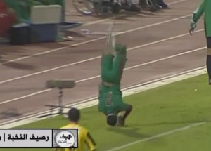 Αμέσως μετά την σέντρα και πριν κοπάσουν οι πανηγυρισμοί των φιλάθλων, η ομάδα του κέρδισε πλάγιο άουτ και ο Σαουδάραβας αμυντικός βρήκε την ευκαιρία για μια «περιττή» ενέργεια, δείχνοντας ότι πρέπει να έχει αφιερώσει πολλές ώρες στην εξάσκηση του συγκεκριμένου κόλπου αναφέρει το tro-ma-ktiko! Ο speaker τα σπάει επίσης!!!